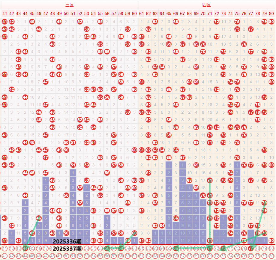 如图所示:在本期大数区的选号中注意在上期的走势中三区间开出了5枚中奖号码,上期依旧还是保持在均值走势,中间位置出现了较长的空位走势,本期要注意空位区继续保持空位,在上期开出41 43的位置下方,注意40 44的同步分边延续走势,在后段位置注意56的顶角形态走势,以及58 62的斜线第三期延续走势,四区间上期开出了5枚中奖号码,在上期断6字头的号码走势之后补出了61 62的二连走势,同时开出了61 71的区间同尾走势,本期注意61 62的位置考虑62 63的二连延续走势,或者是考虑61 62的位置出现断号走势,在上期开出71的位置向前延续68的同路延续第四期走势,以及71 66的交替走势,后段位置注意77的均线走势,以及71 74 77同路再次开出联动走势。