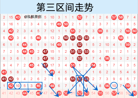 该区间的42 46也是空三类型,他的中心号44号我们也是要注意防守的,上期开出的46 48是两个孤号,本期我们防守一下出重号的情况。上期三连号51 52 53没能落重号下来,那么本期的落号情况就很大了,我们一定要抓一抓。57号是属于遗漏10期的号码,本期遗漏10期的号码有两个,43号的出号几率不是很大,所以这里的57号我们就要做一下号码了。