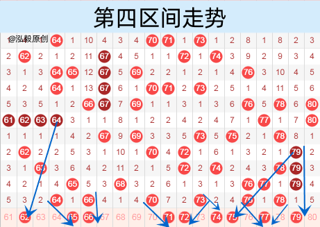 该区间的62号我们要做防守的,有一定的出号机会。65号属于夹号和77是属于同类型号码,我们可以抓一个做一下号码。66 68 70形成了大三角形,那么本期的角重号我们也是要注意的,不能丢了。70 73 75是属于3连空二出号,这里的中间数应该也是要出号的,我们要重点分析。