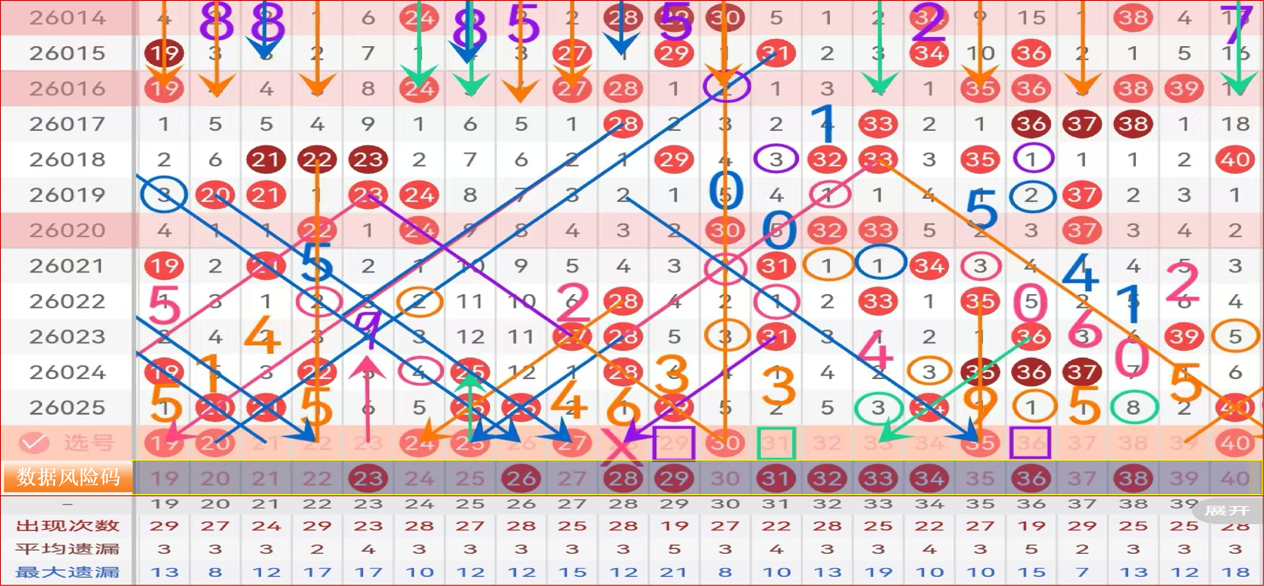 二区间推荐主做号码:24 25 27 30 35 40 防守号码 22 37 39;