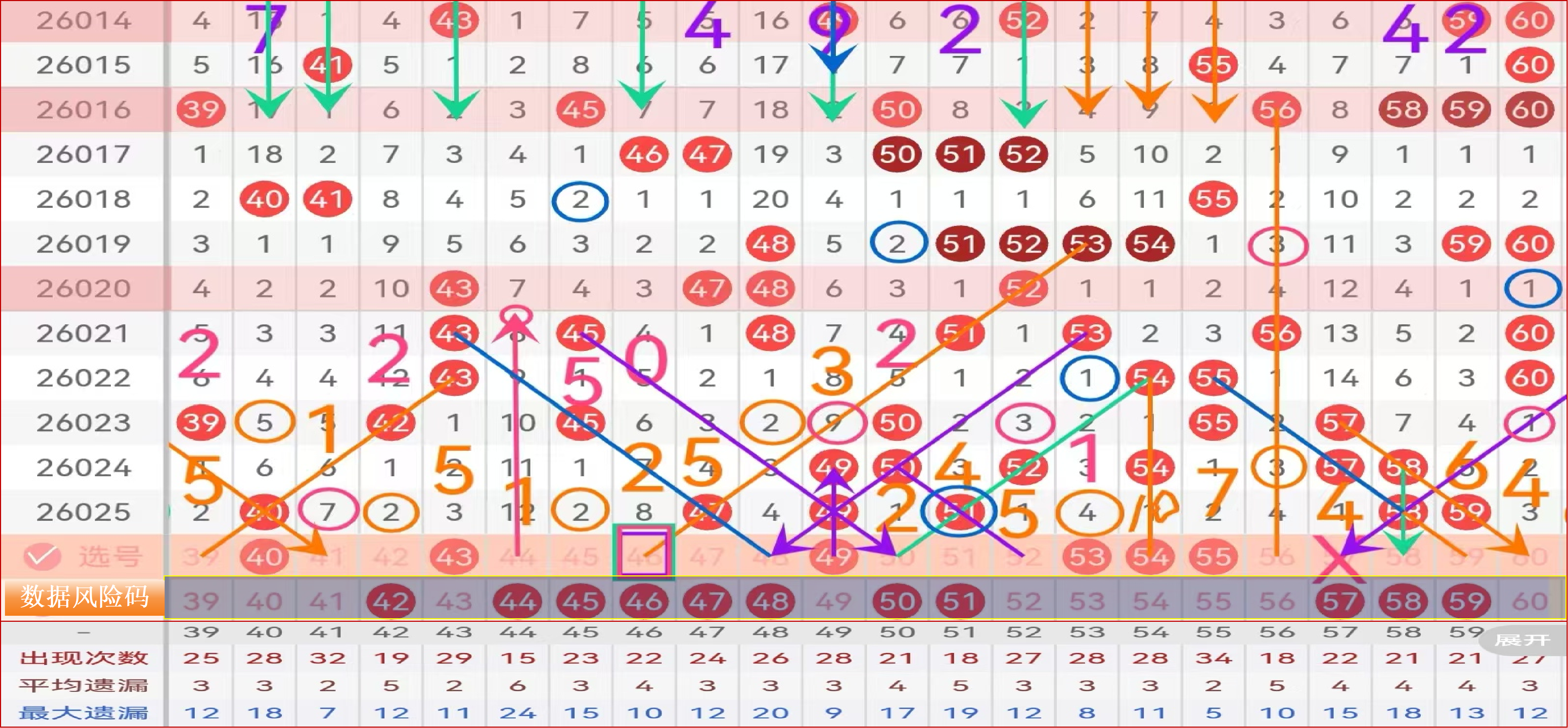 三区间上期出了5个号码,均值开出; 端部41 43二择一做号,这里推荐43小数据,第六次走遗漏3点位,大遗漏的边码,43可主做;4字头尾部的49,本期推荐三重防守;5字头本期推荐中部的三码53 54 55连号防守,非常不错的连号拖码;尾部60走势码,小防;