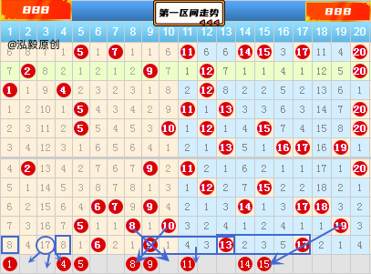 该区间近期都是偏冷状态,我们不宜过多的去作战。本期该区间可以主攻一下8 10以9号为中心形成的对称类型,本期这种类型有两组,我们要重视,其中有一组必然是有号码开出来的,搞不好两组都会有号开出来,当然按照我的判断来说,有一组应该是要断号的,可以做一下防守。这里我们就主看8 9 10的落号情况就可以了。其次就是空三中心号了,本期的空三中心号有三组,开出一个的机会是非常大的,我们可以重点分析。