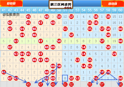 该区间近期都是比较热的,走冷一期的情况估计还得过2两期之后,所以本期我们可以在该区间好好作战一下。该区间我们需要注意的就是连号48 49和52 53的落号,这里应该会有一个号码落下来,首先可以放弃48号落号的可能了,剩余的号码就不在这里分析了。该区间还需要注意的一点就是56 58 60号形成的三角形了,角重号我们必须要重点考虑的。