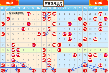 该区间主要考虑两处地方就可以了,一处为三连空一出号60 62 64,这种类型不是出重号就是出夹号,断号的几率是很小的,我们可以逐一分析排号的。其次就是在71-80号数字区间,上期开出了76号,那么本期的73 76 78 80号出号的机会就比较大了。我们一定要把握住。