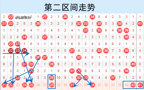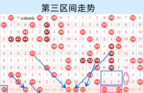 该区间的21号属于遗漏8期的号码,本期遗漏8期的号码有3个为21 41 55,出一个是没有问题的,我们要抓一抓。本期我们要防守一下28 31同落的情况,30 34都是遗漏9期的号码,本期我们可以选一个号码做防一下。连号35 36已经同时遗漏了4期了,本期开始可以做号了,落号机会还是非常大的。