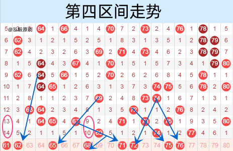 该区间上期60-69断号了,该区间有两个冷号61 68应该会落一个号码出来,我们要注意一下。上期连号空一带号64 65 67没能落下重号来,本期我们要注意它回补的情况。该区间的73 75是中心对称号,02 04意识中心对称号,那么本期这4个号里面肯定是要落号下来的,我们要做好防守。