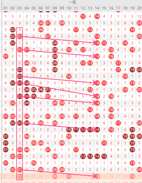 第一区间的走势分析:第一区间上期开出了6个号码球,主要的落号点位在一区间8号位,走出了4偶的形态走势,上期一区间的落下了6个号码球整个一区间处于走热的趋势,根据一区间的走势规律,今天的一区间我们主看3的热码,按往期的3号下一码走势,可重点关注14号位。这三个号球重点关注3、14、19的组合。