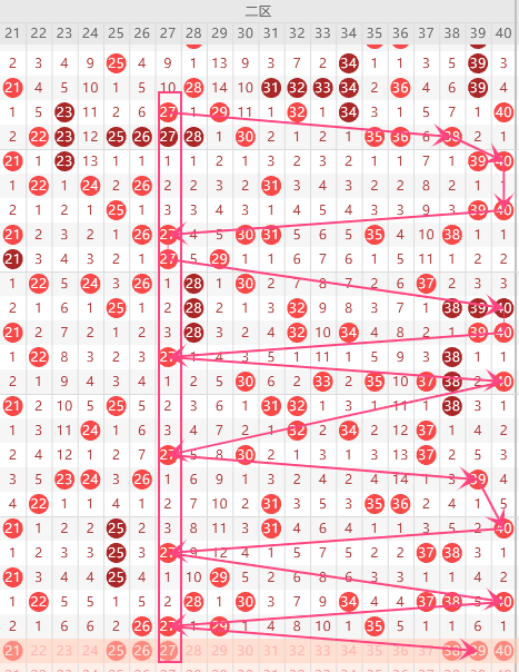 第二区间的走势分析:第二区间上期开出了4个号码球,属于前半区3个,后半区1个码。根据二区间的走势规律,今天的二区间我们主看前半区27的回补,走出了上下对称的走势形态,再看二区间前区位置35这个号码球的落位,重点关注27-39-40组合