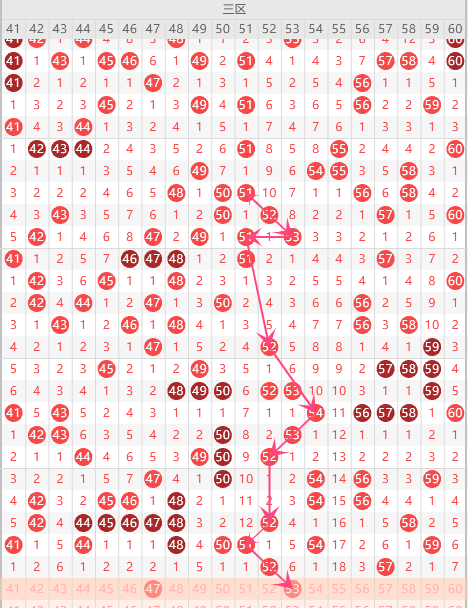 第三区间的走势分析:第三区间上期开出了2个号码球,主要的落号点位在三区间的后半区,走出了1奇1偶的形态走势,后半区落下了3个号码球,根据三区间的走势规律,今天的三区间我们主看后半区位置47、48组合的落位,47属于热码的走势,47走出了连期对称的走势,重点关注47-48-53组合这个号码球的落位。