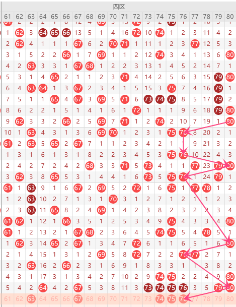 第四区间(61-80)第四区间的走势分析:第四区间上期开出了8个号码球,主要的落号点位在四区间的后半区,走出了3奇3偶的形态走势,上期四区间的后半区落下了6个号码球,整个四区间处于集中的趋势,根据四区间的走势规律,今天的四区间我们主看后半区80这个号码球的落位,根据以往80的落球规律。重点关注63-75-76组合