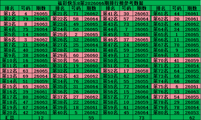 把12期号码按照出现次数排位分为四区:第1-20位为热一区,第21-40位位温热二区,第41-60位为温冷三区,第61-80位为冷四区,从汇总数据可以看到,新数据开始可稍作观望,以临界点为重点