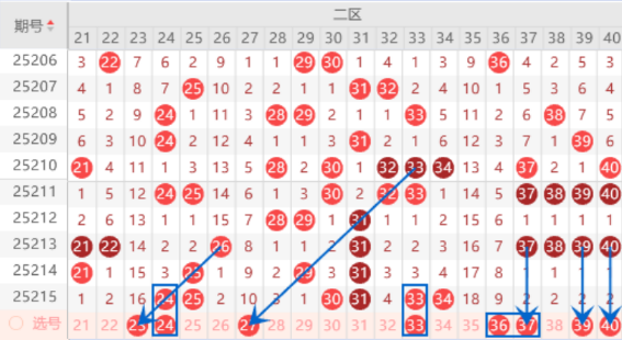 该区间的23号数字我们注意一下出号情况,属于斜四连号码,出号机会是有的。本期的27号数字我们也是要防守一下出号情况,本期可以防守一下27 33号数字同出的情况。上期出了30 31 33 34号数字,本期我们注意一下出一个重号的情况,其中的33 34号数字可以重点关注一下出号情况。四连号37 38 39 40号数字已经断号两期了,本期我们要做注意出号情况,其中的38 40号数字可以重点关注一下出号情况。