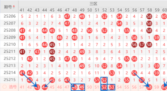 该区间的43号数字我们防守一下出号情况,由于本期的遗漏4期的号码只有2个,所以不一定会出号码,只能做一下防守。本期的48 49号数字我们注意出一个号码的情况,其中的49号数字可以重点关注一下。上期开出了51 52号数字,本期是有机会出一个重号的,其中的52号数字我们可以重点关注一下出号情况。本期的53 54号数字我们也是要关注一下出号情况,其中的53号数字可以重点关注一下。本期的58号数字我们防守一下出号情况,本期可以防守一下55 58号数字同出的情况。