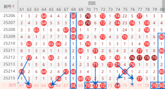 该区间的62 65号数字我们注意出一个号码的情况,其中的62号数字可以重点关注一下出号情况。本期的68号数字是属于141走势,可以防守一下出号情况,连号空一带号71 73 74号数字本期我们注意出一个号码的情况,其中的71 74号数字可以重点关注一下出号情况。本期的72号数字是属于123走势,本期防守一下出号情况,本期可以防守一下72 80号数字同出的情况。本期的79号数字是属于斜四连号码,出号机会也是有的,我们可以关注一下出号情况。
