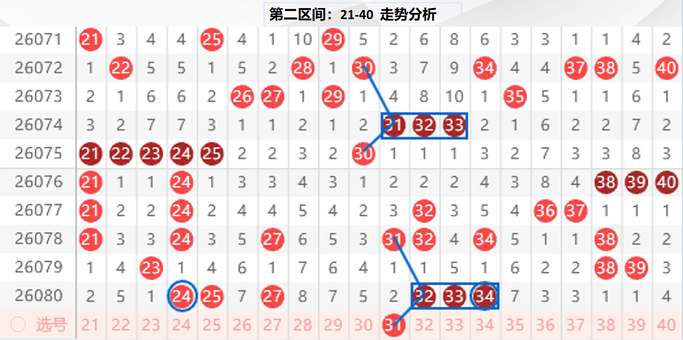 二区分析:【21-40】(走势图标注号码非小黄车大底,请谨慎参考,具体思路将在直播间分享讨论)