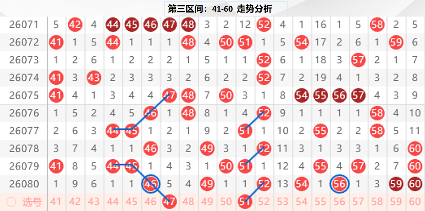 三区分析:【41-60】(走势图标注号码非小黄车大底,请谨慎参考,具体思路将在直播间分享讨论)