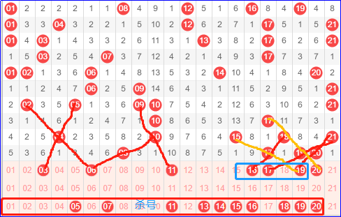 第一区间号码01-20,上一期提醒大家一区关注,想做号可以作连号带尾巴,前半区依旧很冷,后半段开出了17 19 20的连号带尾。尤其是谈到杀号的时候,我们重点提示了后半段,难道杀号就不做了吗,所以无论哪一种工具参考就好了,选号还得靠自己。这一期需要注意蓝色框线里面的号码和上一期连号的重号,毕竟近期出现这样的概率有点高。