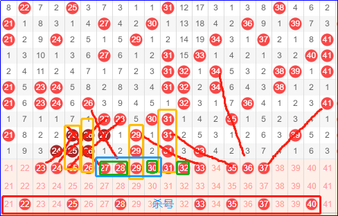 第二区间号码21-40,上一期咱们讲二区是当前最热的区间,而且直播的时候咱们强调本区本期开出不少于五个号码。但是下一期号码满眼望去皆是号,这就要用到我们说的方法了,分区分段。前半段注意蓝绿标注的号码,后半段可以连号来展开作号。