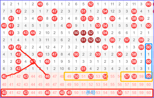 第三区间号码41-60,本区这一期五转二,直接奔冷态,我甚至觉得这样的走势看起来有点迷惑人心,你认为呢? 。虽然目前走势上是有点无从下手,但不至于一下子全部抛弃。尤其是前半段刚有一点迹象就闪人。但是请记住我们是根据走势,追热不追冷。大局面上这一区相当于暂时抛开,小局面可以适当作黄色标注号码。