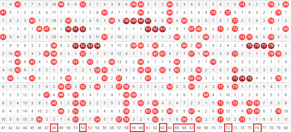 接下来我们一起看走势图,我们把01-40分为前区,41-80分为后区。