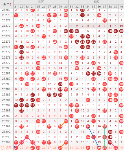 三区开出:21,22,24,26,27,30 奇偶比: 2:4 和值:150 跨度:9,上期开出6个号码,偶数号码占优势。本期三斜连走势:21 25,隔码斜连走势:21,近10期平均出号2.6枚。推荐关注号码:21、24、25、29。