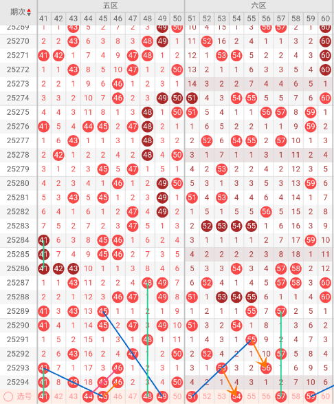 六区开出:(未出号),上期开出0个号码,本区空开。本期无三斜连走势,隔码斜连走势:51 59。近10期平均出号2.1枚,本期推荐关注号码:51、54、57、59。