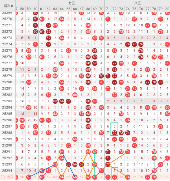 七区开出:61,62,70 奇偶比: 1:2 和值:193 跨度:9,上期开出3个号码,偶数号码占优势。本期三斜连走势:61 69,隔码斜连走势:66。近10期平均出号2.5枚,本期推荐关注号码:64、66、68、69。