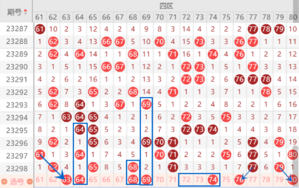 本期的63号数字是属于三斜连号码,64号数字是属于空一对称号码,我们要注意同出的情况。本期的68号数字我们要注意走重的情况,机会还是很大的。69号数字是属于空二对称号码,出号机会也是有的。三连号72 73 74本期应该是会落下号码来了,本期我们要注意一下73 74的落号情况就行了。本期的80号数字我们可以防守一下80号数字回补的情况。