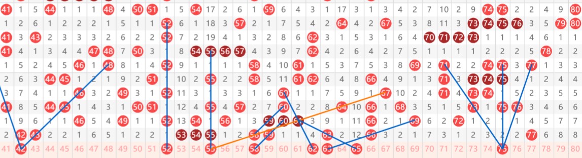 【第二区间41-80】:上期开出10个号码。本期推荐:42-52-55-58-62-63-65-75八个号码。42斜连和同路走势号码;52遗漏一期号码,在不断号的情况,看好以同形态继续开出,同时与42形成区间同尾出号;55同路五期,形态与52相同;58重号三重斜连形态号码,是最为常见形态;至此,有此号段完整同路出号趋势;62同路和斜连号码,有望与同路三期号码63形成对子开出;65斜连三期号,此号码一般遗漏五期就开出,至此已经大遗漏12期,作为防守;75同时具有斜连二重、遗漏1-2-3形态,有出号较强趋势。区间推荐重点号码:三小区间52-55-58,四小区间62-63-65。