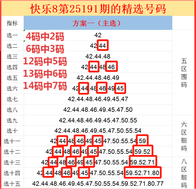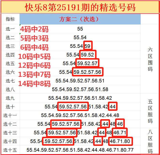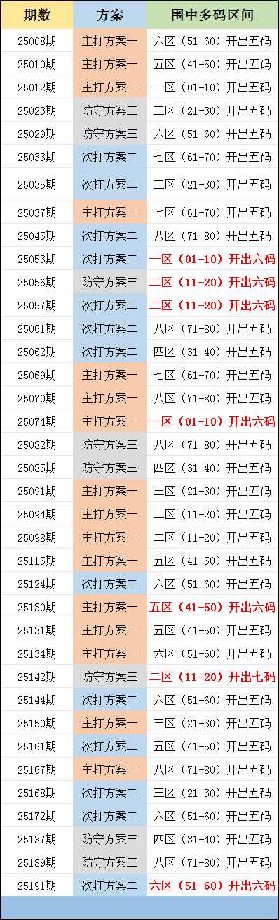 上期方案二次选的6区,开出6码走势,可惜8个围码只抓住了4个号码,要是6个号码都围中的话,就拿下选十的14码复式一等奖了!!