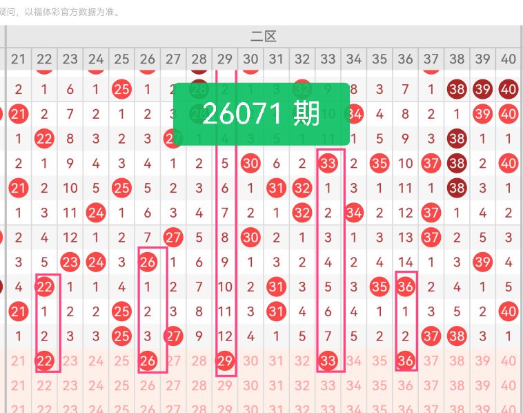 上期第二区间开奖4个号码,本期可能会增加开出。22作为二区前段的偶数,紧邻上期25号左侧,填补了21-25段的号码空白,与二区前段的21号形成呼应;26为二区中段偶数,位于25号右侧,承接上期25号的出号热度,与22形成4号间距,让二区前段的偶数分布更均匀;29是二区奇数的核心点位,处于25-30段的中间位置,既补充了上期25、27号后的奇数空缺,又与26形成奇偶交替;33为二区后段奇数,位于30-40段的中间刻度,填补了37号左侧的奇数空白,与36形成相邻奇偶;36是二区偶数的收尾号码,紧邻上期37号左侧,与33形成3号间距,同时让二区5枚号码覆盖22-36的连续区间,完整覆盖21-40的全段范围。