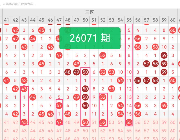 上期第三区间开奖6个号码,本期可能会减少开出。43作为三区前段的奇数,紧邻上期42号右侧,形成相邻号搭配,延续了三区前段的出号节奏,同时填补42号后的奇数空白,与45号形成2号间距,让前段分布更均匀;47为三区中段奇数,位于45-50段之间,承接上期45、46号的热度,与43形成4号间距;50是三区的关键刻度号,处于50号与47形成奇偶交替,同时衔接前段与后段号码,让三区分布更连贯;52为三区后段偶数,位于50-55段之间,填补54号左侧的偶数空白,与50形成2号间距;55则是三区奇数的收尾点位,紧邻上期56号左侧,形成相邻号搭配,延续三区后段的热度,与52形成奇偶交替。