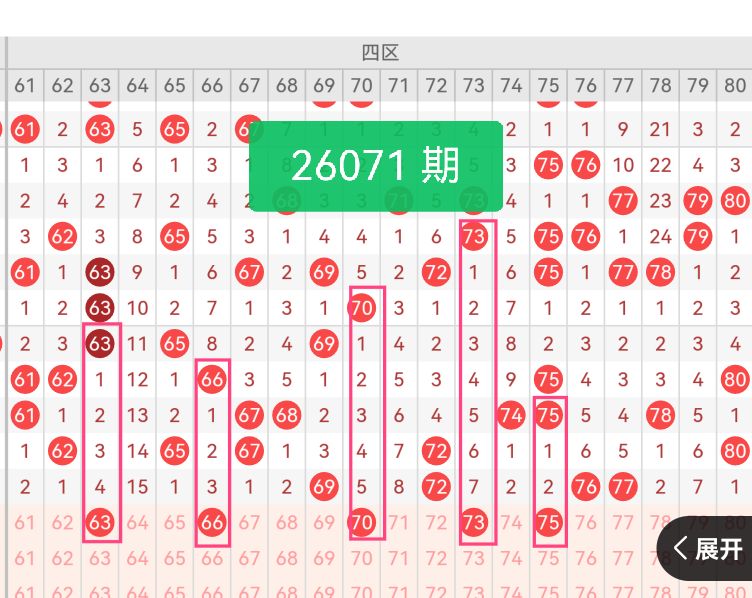 上期第四区间开奖4个号码,本期可能会增加开出。63作为四区前段的奇数,紧邻上期69号左侧,形成6号间隔,填补了61-69段的号码空白,让区间分布从63号开始,避免了号码集中在70号以后;66为四区前段偶数,位于63-70段之间,与63形成奇偶交替,填补69号左侧的偶数空白,保持四区前段的奇偶平衡;70是四区的关键刻度号,处于70号中点,作为偶数支撑,与66形成合理的间距。