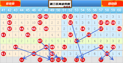 前面已经说过空二类型的出号情况了,所以该区间的46 49号这组空二组合的中间数47 48号我们也是要重点关注的,47号是属于重号空二对称类型,它又和49 51号形成3斜连,相比于48号出号趋势要明显一点,所以我们就重点关注47号的出号情况就可以了。50号和47 48 49号形成了斜四连,最近期数内出现4斜连的情况比较少,所以本期的斜四连号50号很可能要断号,我们做防守就可以了,主要还是看它的邻号49 51号的出号情况。49号属于3重号类型,近期开出的3重号有点频繁,所以我们不得不关注一下,51号没有太明显的出号趋势。所以这里我们就重点关注49号防守50 51号吧。再来看57 59号以58号为中心形成了对称类型,这种类型的号码组合也是最容易出号的,所以这里的57 59号也是我们本期重点关注对象。