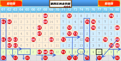 上图中67 68 69 71号也是连号空一带号类型,既然前面的那组组合我们选了夹号,那么此处我们就必选要关注它的重号出号情况了。68号是断斜连号69 71 72号续斜连号,69号是冷号70号的邻号,这两个号码的出号几率都是比67号大的,所以这里我们就主看68 69号防67号吧。分析到这里,突然想起来,这两组连号空一带号组合的夹号都是冷号,按照此种情况下是有很大概率要出一码的,可以重点作战的。上期在71-80号数字之间断号了,本期在该区间有两个冷号74 77号,本期很看好会出一码的,77号属于遗漏10期的号码,本期还有另一个遗漏10期的号码为34号,既然前面的34号数字我们作为防守号来用,那么这里的77号我们就要重点关注了,及74号我们就暂时放弃吧。好了,本期分析就到这里了。