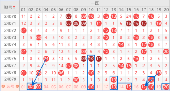 本期的02 05号数字我们注意出一个号码的情况,重点关注一下02号数字出号情况。本期的09 10 11号数字我们注意一下出号情况,09 11是属于交叉对称号码,有机会出一个号码的,这里可以防守一下出2连号的情况。本期的14 15号数字我们注意落下一个号码的情况。本期的17号数字我们注意一下出号情况,本期属于三斜连号码,可以防守一下17 18号数字同出的情况。本期的20号数字我们关注一下出号情况,上期开出了18号数字,那么本期就有机会把20号数字带出来的。