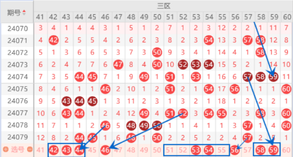 该区间的42号数字是属于遗漏8期的号码,本期遗漏8期的号码有三个,本期我们也是要注意出一个号码的情况。本期的46号数字我们防守一下出号情况,毕竟44 45同出带的46号数字很频繁的。本期的53 56 59号数字我们要注意出一个号码了,重点关注一下59号数字的出号情况。本期的51 52 54 55号数字我们也是要注意出号情况的,重点关注一下51 54号数字出号情况就行了。本期的58号数字是属于空二对称号码,本期我们注意防守一下58 59号数字同出的情况。