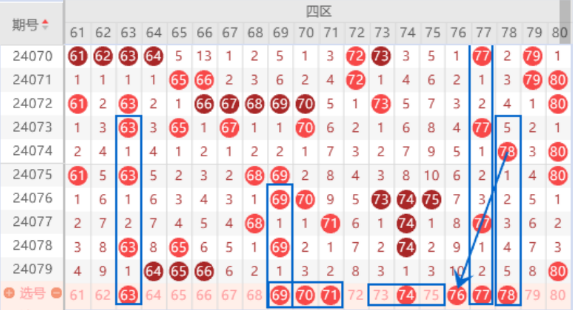 本期的63号数字我们注意一下出号情况,属于121走势,这种类型的号码很久没有出号了,本期可以关注一下。本期的69号数字我们注意一下出号情况,属于空一对称号码,出号机会还是有的。本期的73 74 75号数字我们注意落下一个号码的情况,重点关注一下73 74号数字出一个号码的情况。本期的76号数字是属于遗漏10期的号码,本期遗漏10期的号码有2个,本期我们注意出一个号码的情况。本期的78号数字是属于空五对称号码,出号机会还是有的。