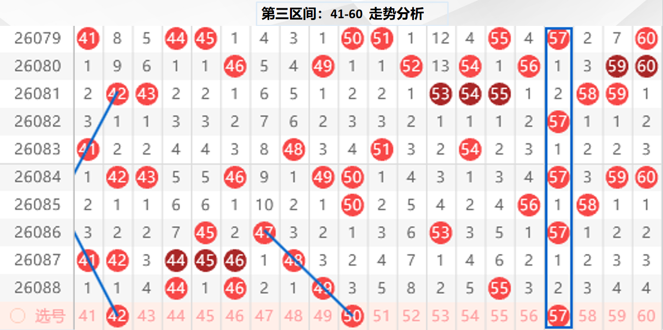 三区分析:【41-60】(走势图标注号码非小黄车大底,请谨慎参考,具体思路将在直播间分享讨论)