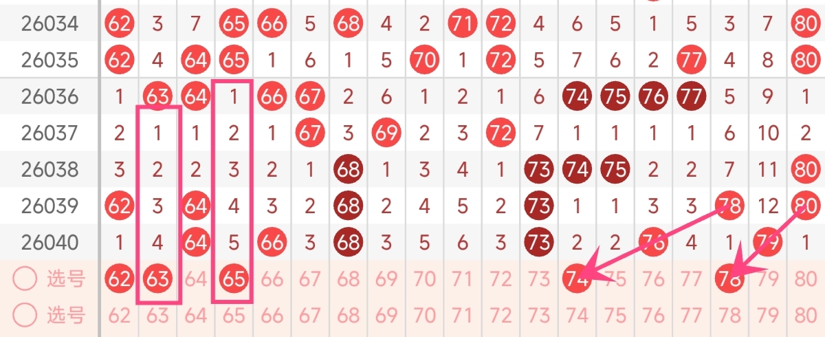 近期出号情况较为复杂,冷热号码交替明显。62和74在近期成为四区热门。这两个号码可能在整体的号码组合中具有独特的优势。而63和65已经连续17期未出现,属于冷号范畴。本期选号可以把66和73作为重点,也可适当搭配62和78。而且还需注意已经连续多期漏出的号码,本期有几率回补。综合考虑,本期四区推荐关注号码:62、63、65、74、75。