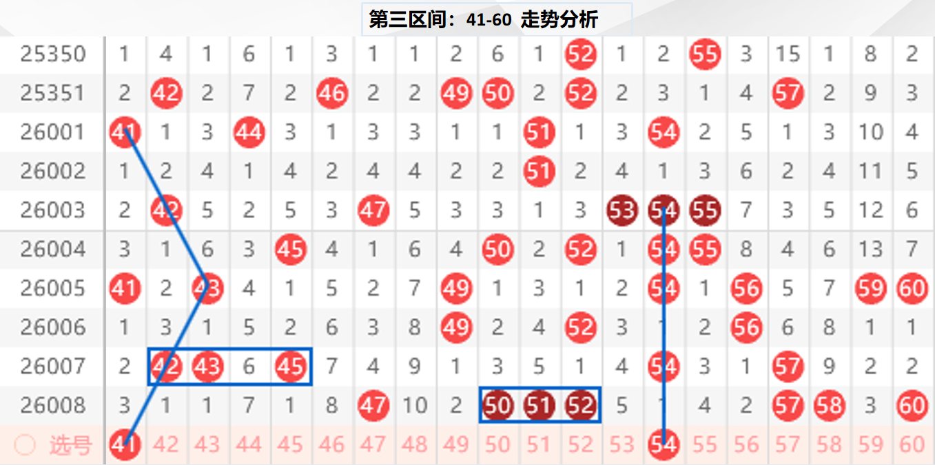 三区分析:【41-60】(走势图标注号码非小黄车大底,请谨慎参考,具体思路将在直播间分享讨论)