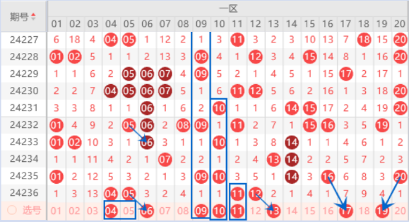 上期开出了04 05号数字的连号,本期是有机会出重的,如果本期这里出重号,那么可以重点关注一下05号数字,如果不出重的话,那么出现分边的情况就很大,所以本期的06号数字我们也是需要关注一下出号情况的。上期开出了11 12号数字,和09 10号数字形成了阶梯类型的号码,所以本期的13号数字我们可以关注一下出号情况,也要防守一下11 12号数字出现重号的情况。
