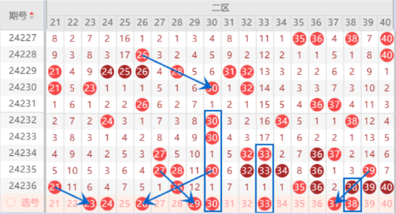 上期的连号空一带号30 32 33 34号数字没能开出重号来,本期我们要注意回补号码的情况,重点关注一下30 33号数字的出号情况,尤其本期的33号数字是属于三连号落号情况,本期的出号机会是很大的。上期开出了三连号38 39 40号数字,本期我们要注意出重号的情况,其中的38 40号数字可以重点关注一下,尤其是其中的40号数字出号机会很大,毕竟38 40号数字同出,大多数重的都是40号数字的,所以可以重点关注一下。