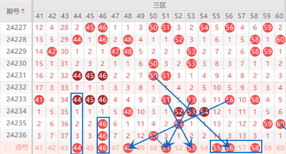 本期的41 44 47号数字是属于尾数1路号码,已经遗漏3期没有出号了,本期是有机会出一个号码的,其中的41 44号数字我们可以重点关注一下,都是属于遗漏3期的号码,出一个号码的机会很大,可以重点关注一下44号数字的出号情况,所以本期的33 44号数字我们要好防守情况。本期的51 53号数字是属于交叉对称号码,本期也是有机会出一个号码的,上期开出了50号数字,是有机会把本期的51号数字带出来的,所以本期的51号数字可以重点关注一下。