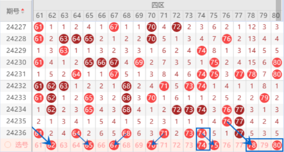 上期开出了61 64 68 71号数字都是属于孤号,所以本期的62 63 65 67 69 70号数字我们是要重点关注的,这些号码里面大概率会开出2-3码来,我们也是可以在这里定号码的,其中的62 65 67 70我们可以重点关注一下出号情况。本期的78 80号数字都是属于遗漏5期的号码,又是属于遗漏交叉对称号码的回补,本期是有机会落下一个号码来的,我们可以重点关注一下。