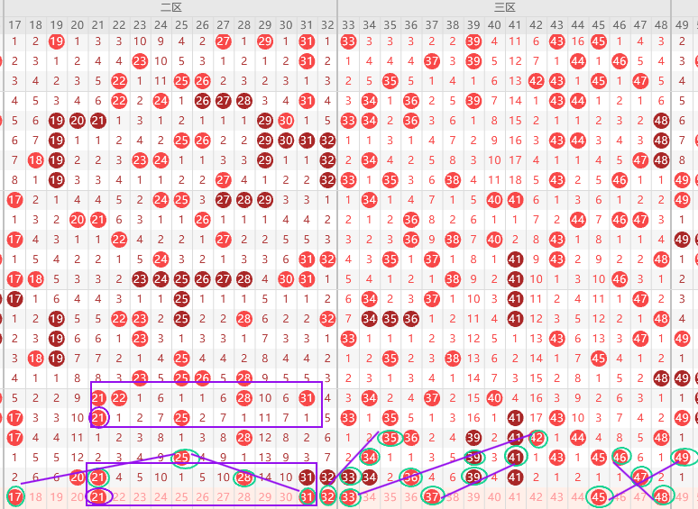 二区胆尾0尾2尾,边号19 22 27 29 30出1-2码,重号20 21 28 31 32出1-2码,重号断2期,本期重号应该回补,今天21是大明号,形态上跟上面一样,上图已勾画,这种大明号我不推荐,喜欢明号可自己选择,可以防31,形态上17 31 32是斜连号,上图已勾画,本期重号优先看32其次20,本期1开头有号17 18 19 三出一,缩小范围17 19二出一,19昨天正点位没出,本期19是短期最大遗漏值可以关注,结论关注五码17 19 20 30 32防23