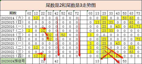 在这个走势上面还可以逆向思考,在022期的号码33往回斜开之后落在本期号码13上面可以形成一个斜开三连号:33,23,13,我个人在这个尾数上是比较看好逆向思考的