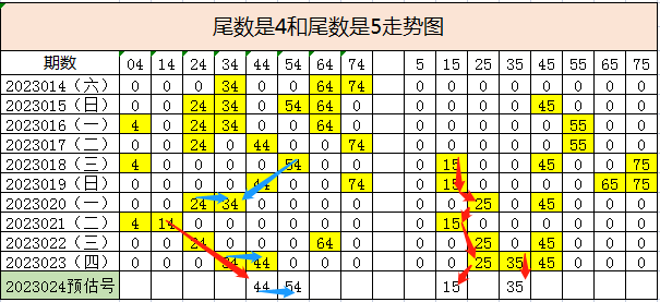 在021期的23斜开三连号23,33,43之后,今天会不会继续斜开连号很难说,毕竟这个区号码23开出了5期重号,