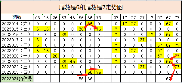 尾数6出现16次,尾数7出现21次