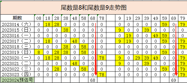 尾数8出现18次,尾数9出现24次